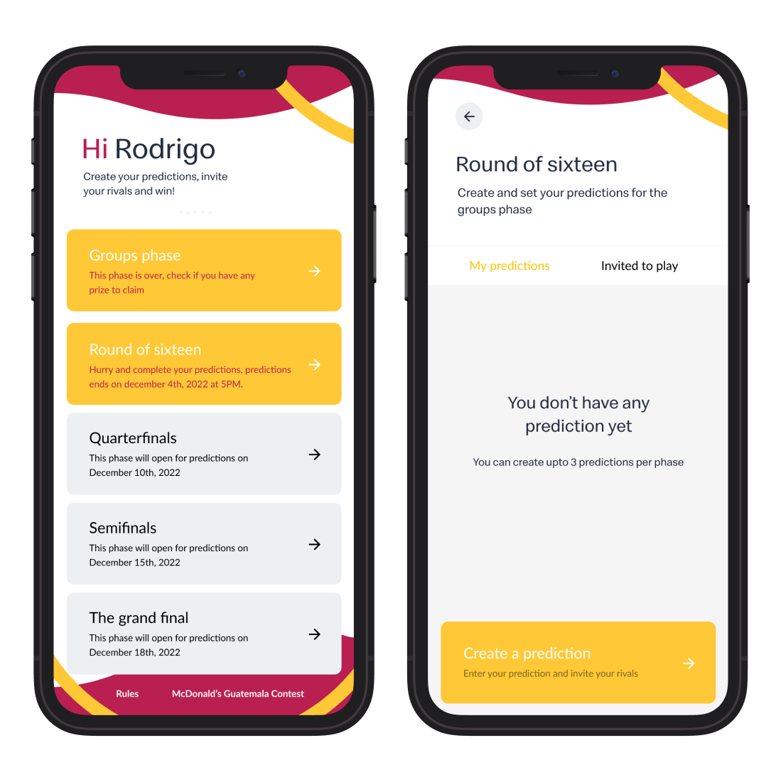 مع إطلاق تطبيق التنبؤ ، تمكنت الحملة التسويقية لشركة المطاعم المشهورة عالميا من جذب الناس. وقد مكن مستخدمي تطبيق الهاتف المحمول الأساسي للمطعم من التنبؤ بنتائج مباريات كرة القدم ، مما عزز الشعور بالصداقة الحميمة والمنافسة الودية. صنفت لوحة المتصدرين المستخدمين بشكل منهجي على دقة توقعاتهم. تمت مكافأة المشاركين الأوائل بجوائز يمكن استبدالها داخل التطبيق الرئيسي. تولى العميل مسؤولية توفير تصميم التطبيق ومتطلباته ومفهومه الشامل.
