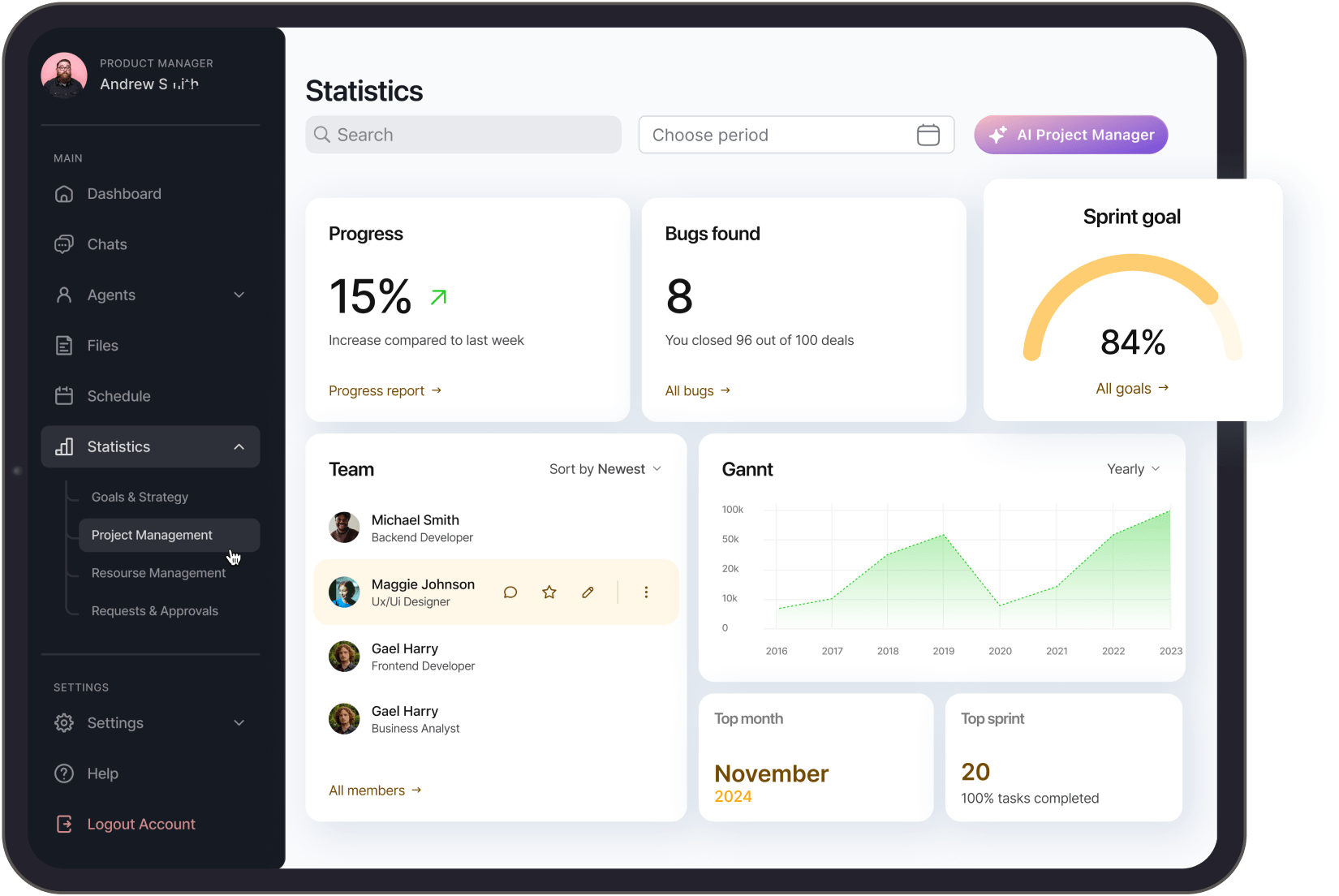 On the other hand, for employers, the assistant developed by us, collects metrics on the use of all documents, tracks meetings held and creates reports on all employees and their unique agents.