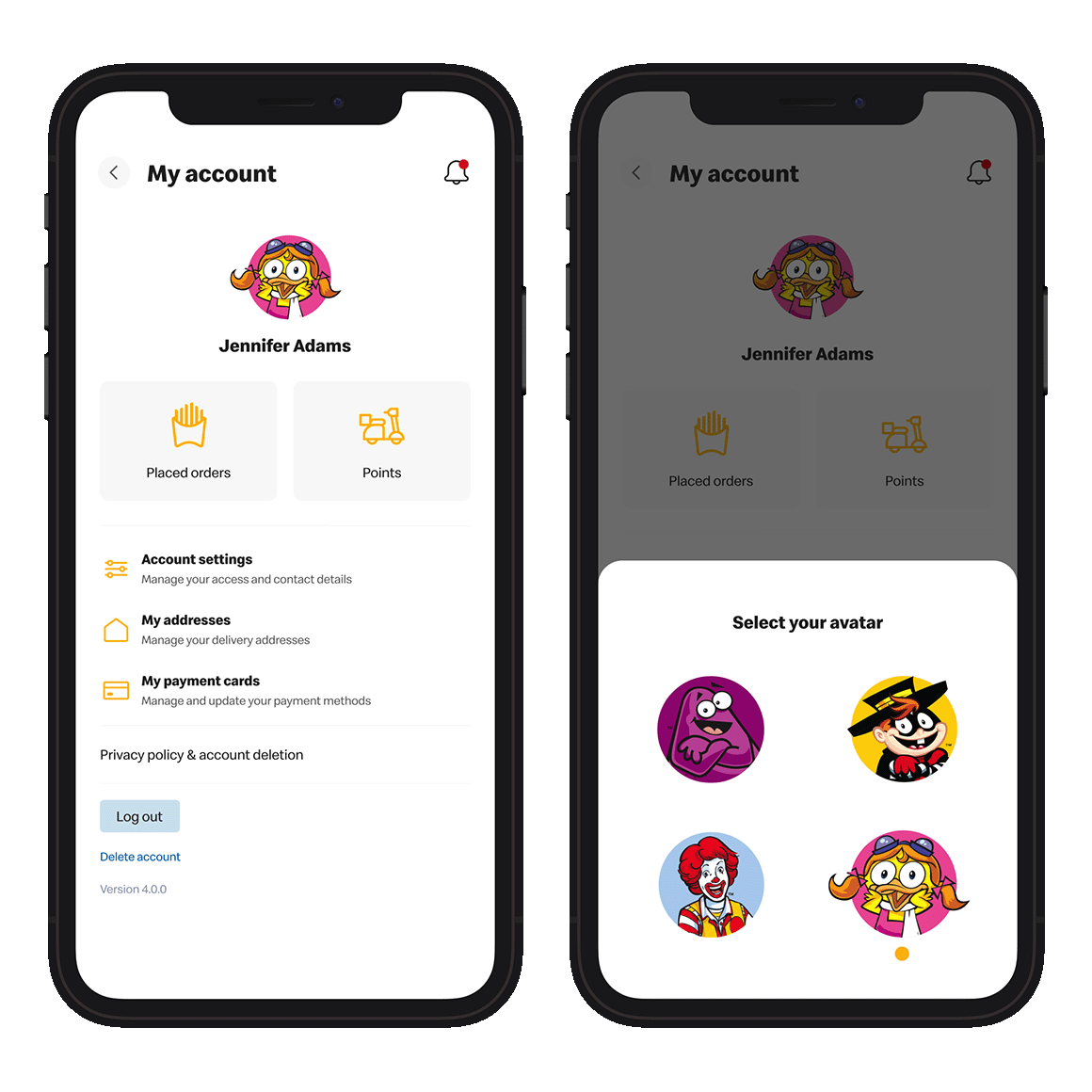 Our primary objective was to establish a unified account system across all versions of global fast food brand app creation. To enhance user experience, we developed an integrated account ecosystem. According to the mobile app development services, this ecosystem allows users from 4 countries to conveniently place orders, access personalized offers, track deliveries, and maintain order history, notifications, and reward points across all devices. This approach enables users to have a single account that consolidates their points progress, payment methods, and delivery addresses, eliminating the need for repeated data entry. Additionally, users can personalize their accounts by selecting from a range of pre-designed avatars.