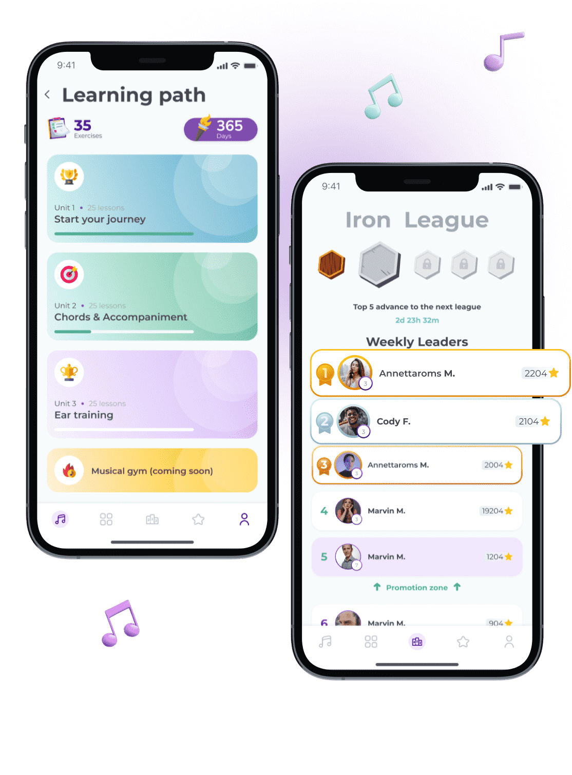 The development path of all-rounder music learning app with 3-directed, 12-branched tree of Talents that gives the users an opportunity to unlock the unique music learning program and encourages them to become more engaged in the music theory learning process and weekly competitions.